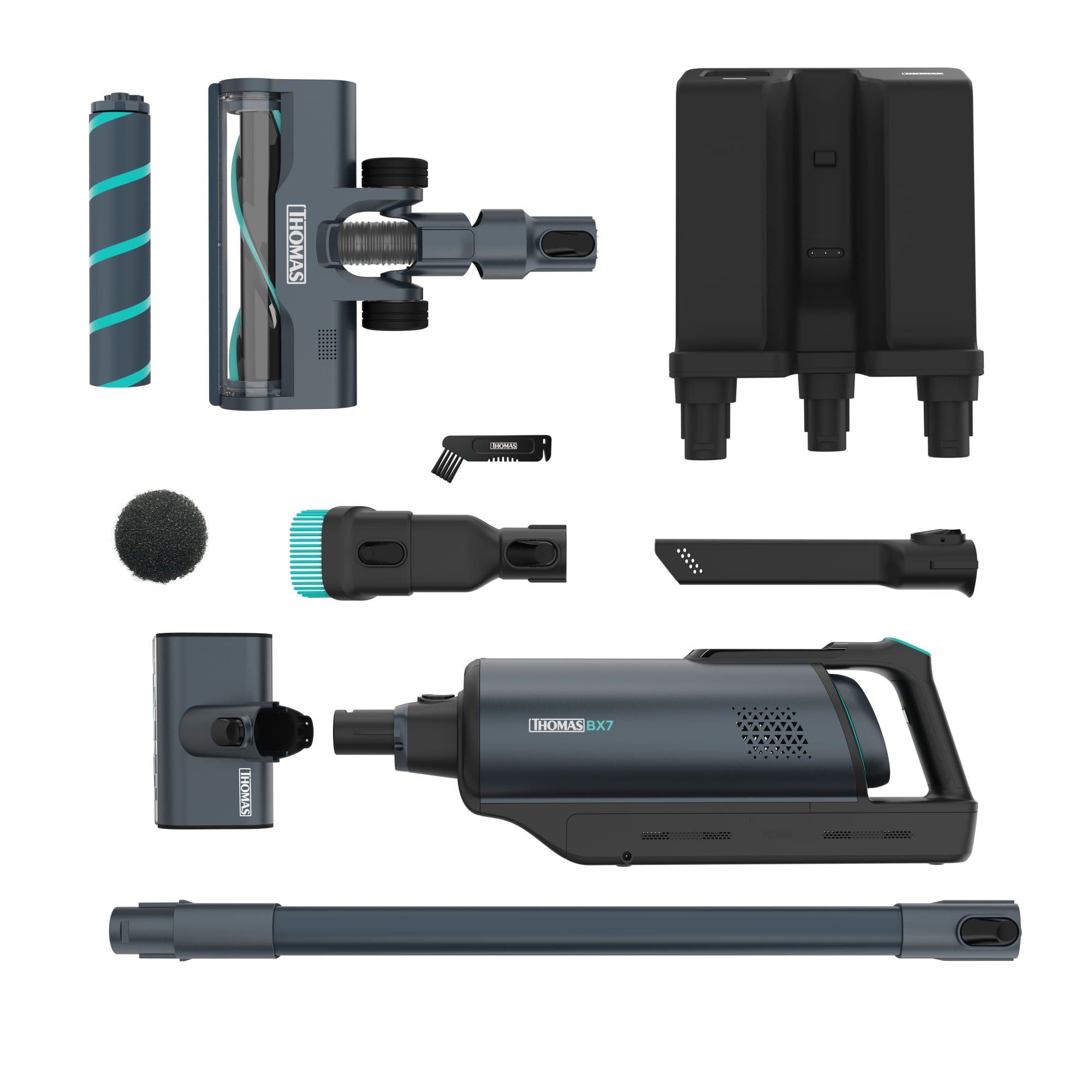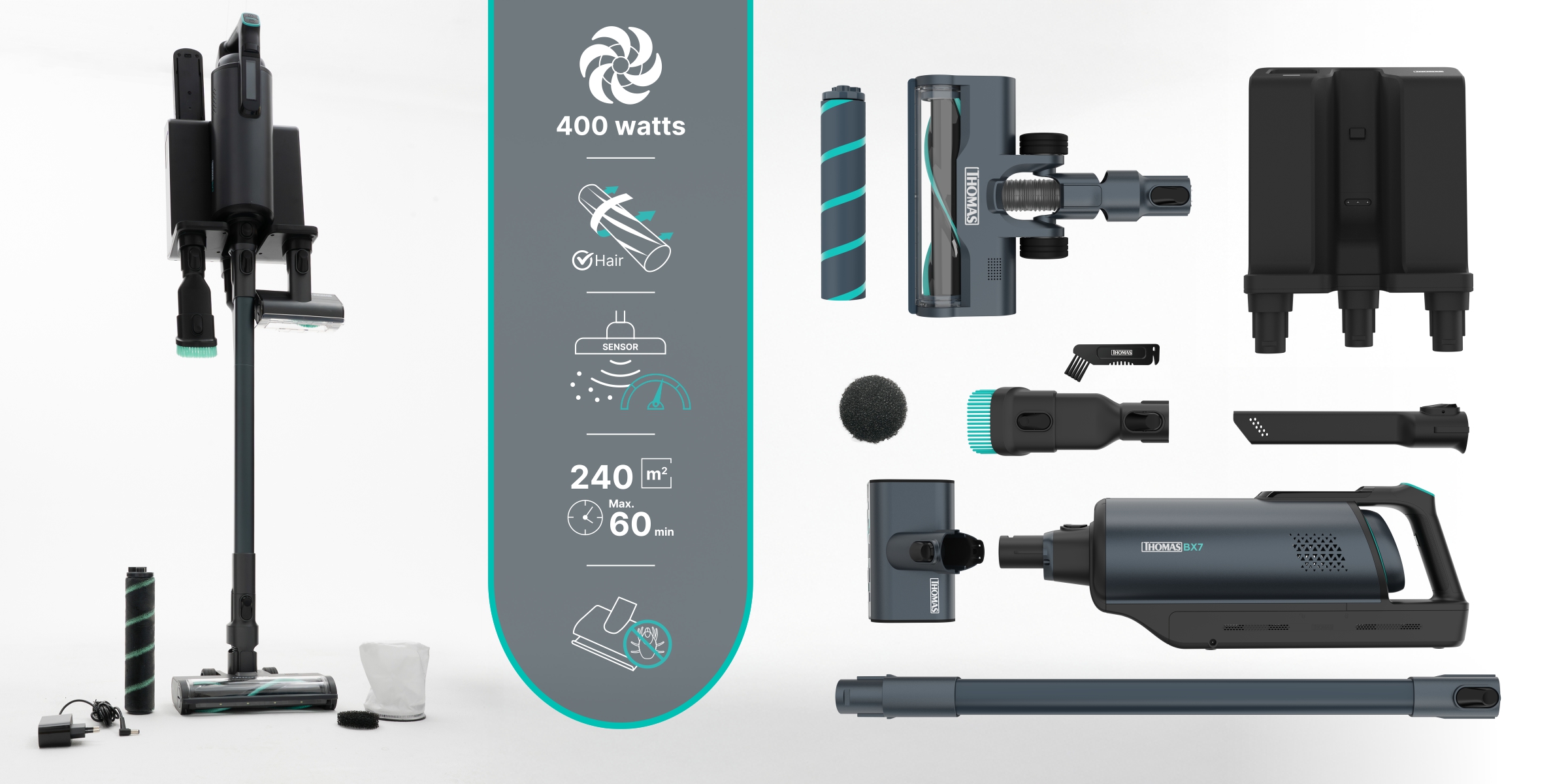 Thomas BX7 to kompleksowe rozwiązanie dla osób, które oczekują od odkurzacza najwyższej wydajności. Dzięki mocy 400 W i licznym innowacjom dla alergików zapewnia skuteczne sprzątanie w całym domu. W zestawie znajdują się wszystkie praktyczne akcesoria, a stacja ładowania, możliwa do montażu na ścianie, umożliwia wygodne przechowywanie i szybkie ładowanie. Całość została zaprojektowana w Niemczech, łącząc niemiecką precyzję z nowoczesnym designem i funkcjonalnością.